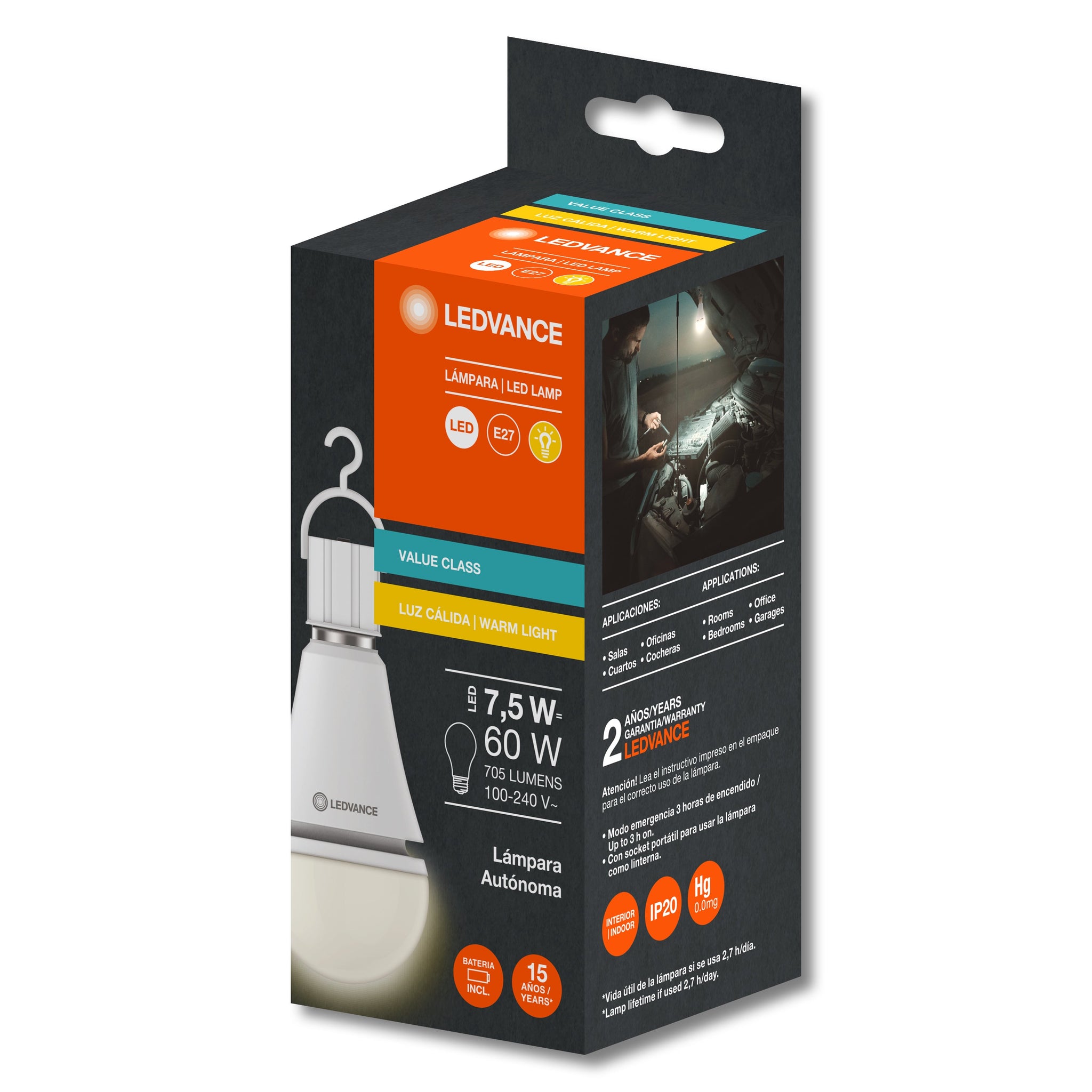 La lámpara de emergencia asegura la iluminación en todo momento, ya que funciona como un bulbo normal y gracias a su batería integrada, cambiara a modo emergencia de forma automatica cuando haya una interrupción en la energía electrica (hasta 2.5 hrs)